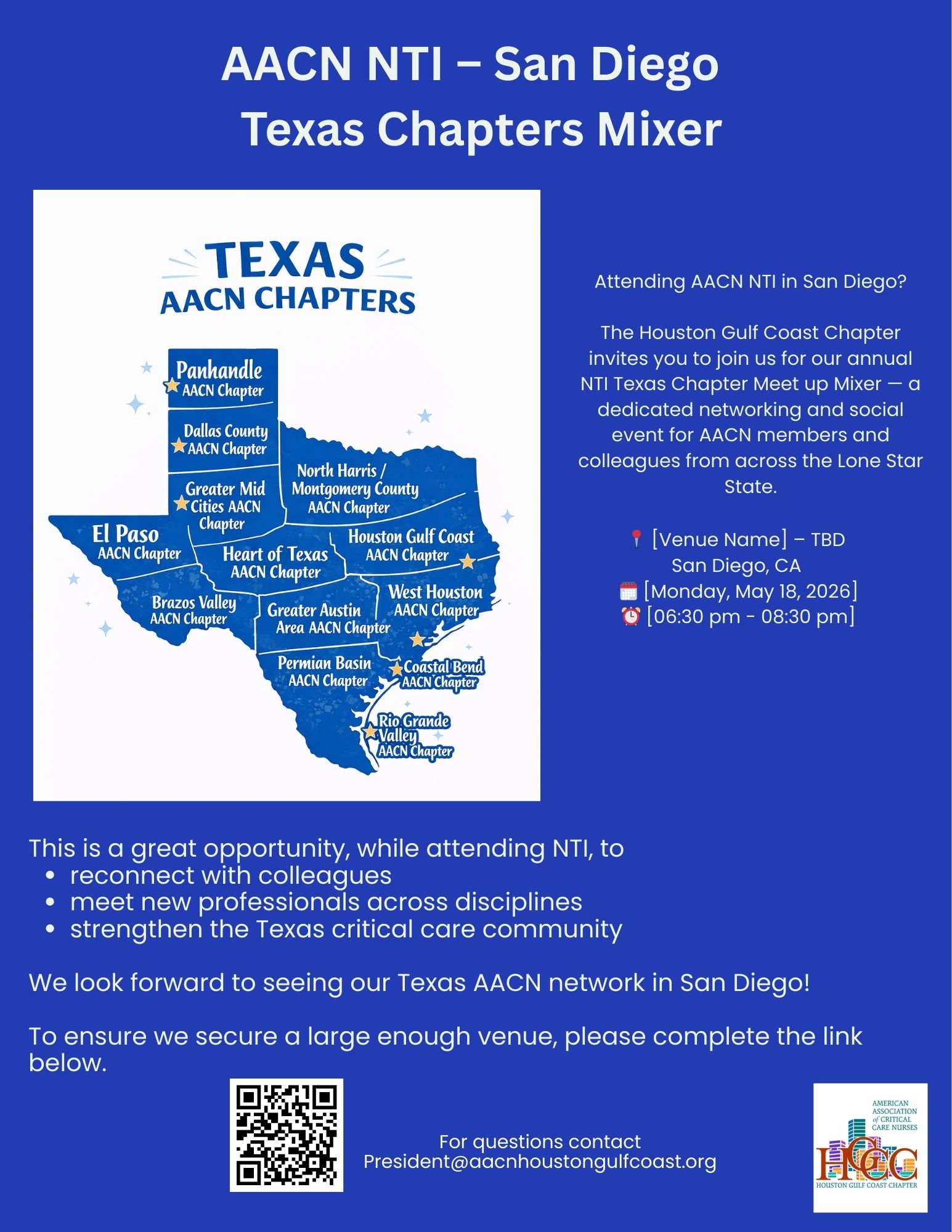 Join us for a fun-filled night of Texas camaraderie and connection! Come represent your Texas AACN Chapter, reconnect with colleagues, and meet fellow critical care nurses from across the Lone Star State. Please scan the QR code on the attached flyer to indicate your interest and help us plan for this event — we can’t wait to see you in San Diego!